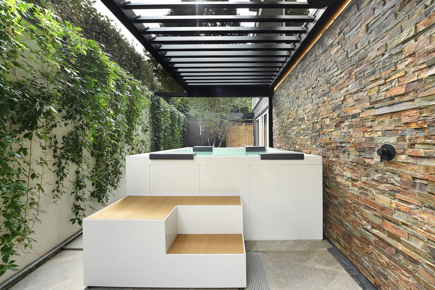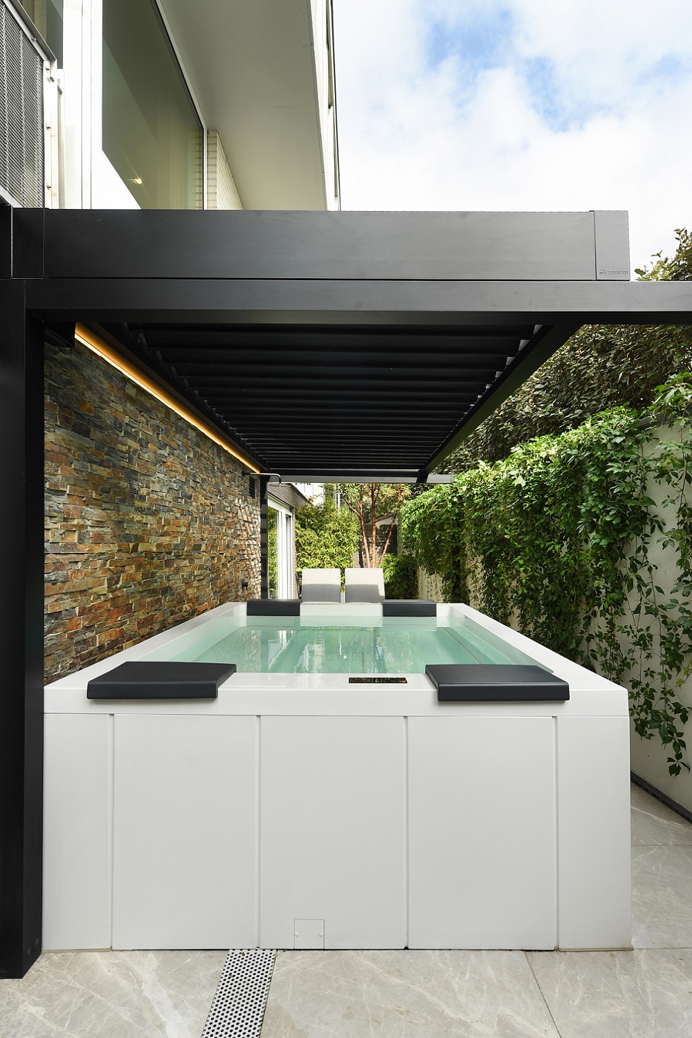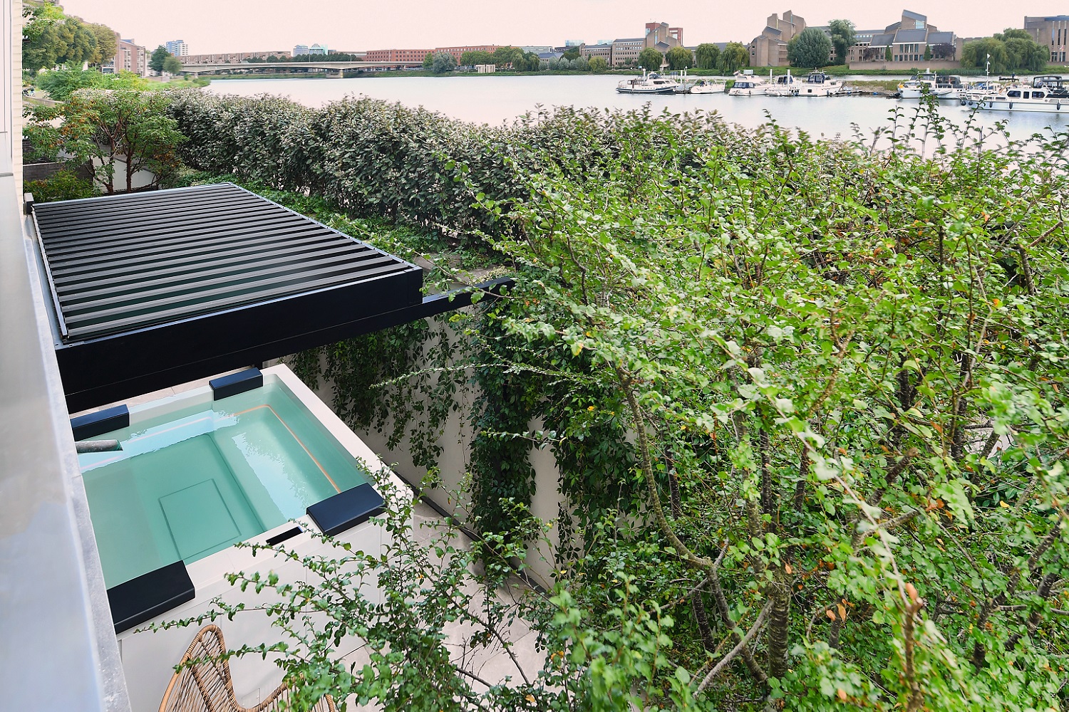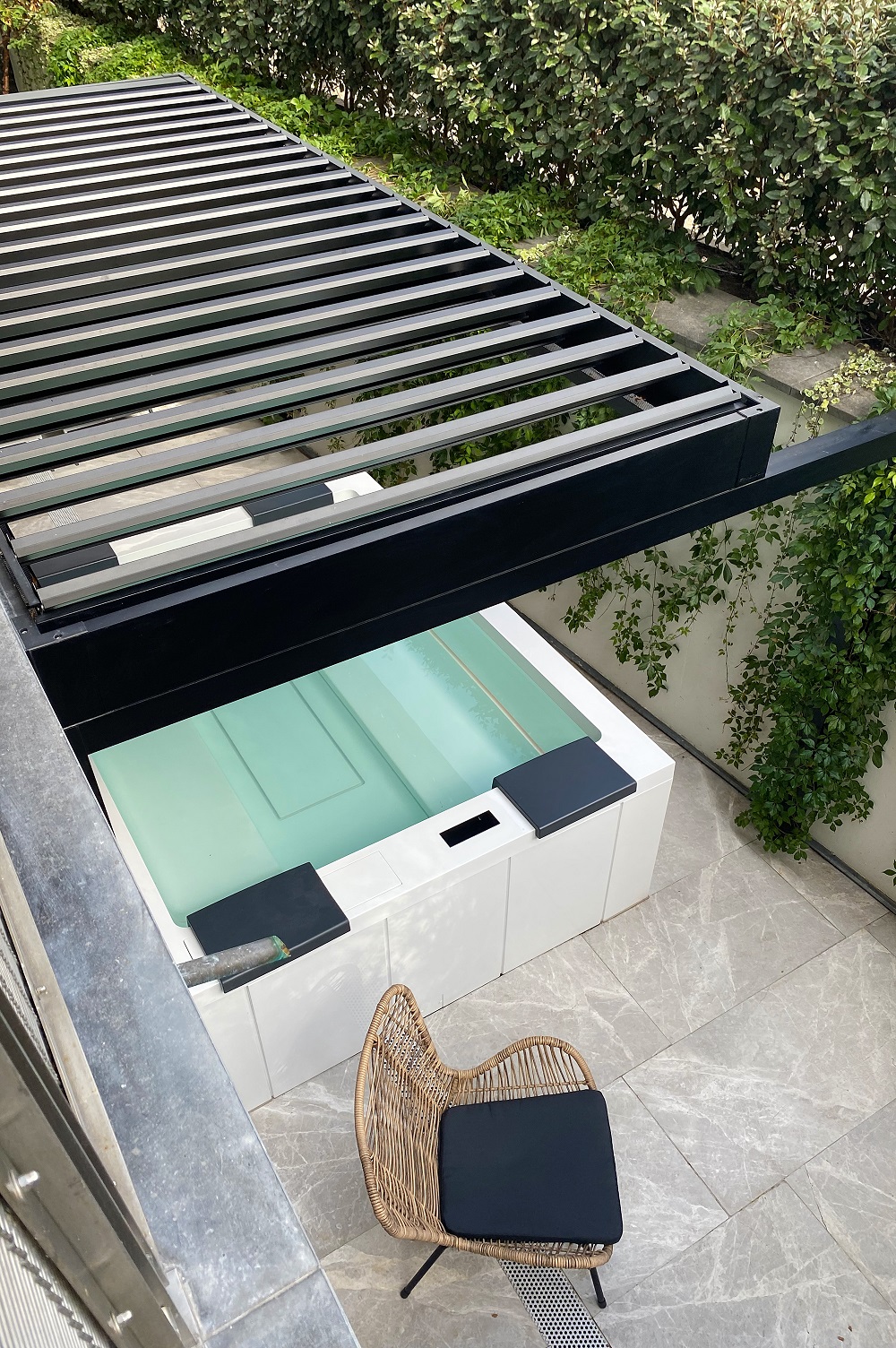 In de patio van een appartement langs de Maas in Maastricht realiseerden we een Renson lamellendak boven een spa.