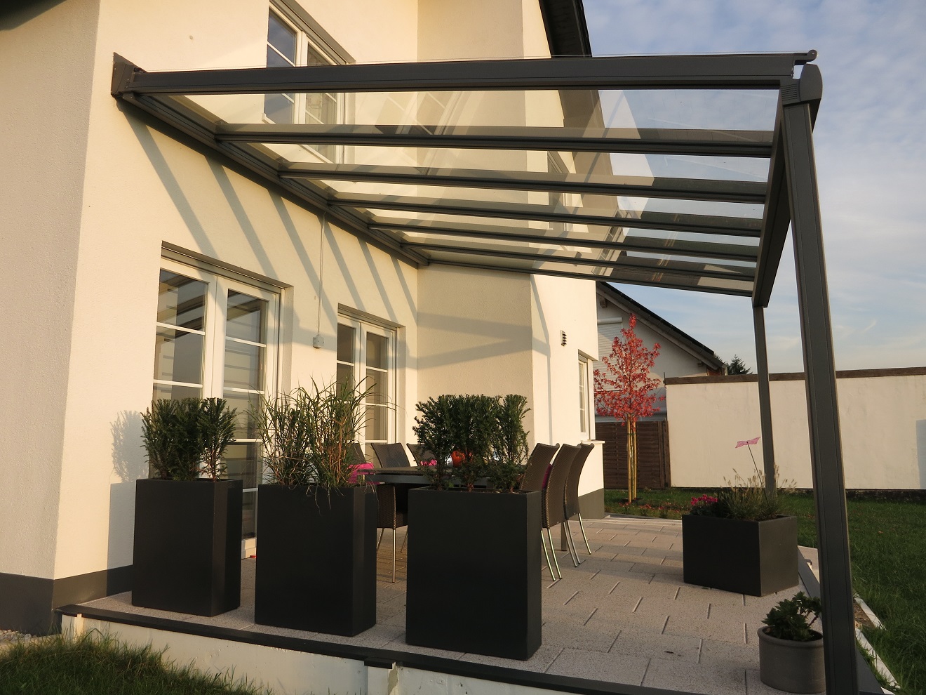 Sinds 2019 hebben aan de achterkant van het huis een schitterende overkapping met een zonwering. Daar genieten we dagelijks van. Ik heb alleen spijt dat ik niet eerder deze hebt besteld!